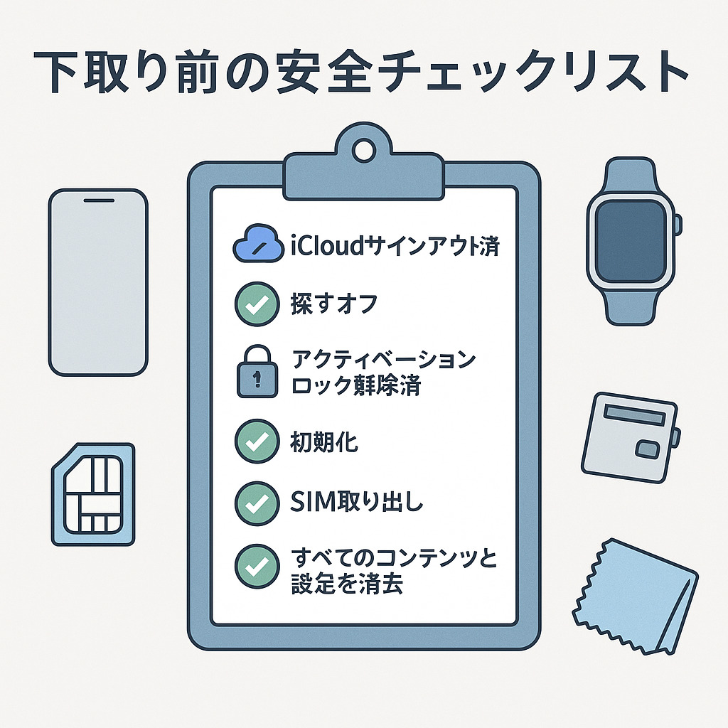 最後に「すべてのコンテンツと設定を消去」→Hello画面まで戻し、eSIM・Suica・カードの整理を行い、外装クリーニングと付属品確認で仕上げます。これで“持ち込み可”のラインを確実に超えられます。