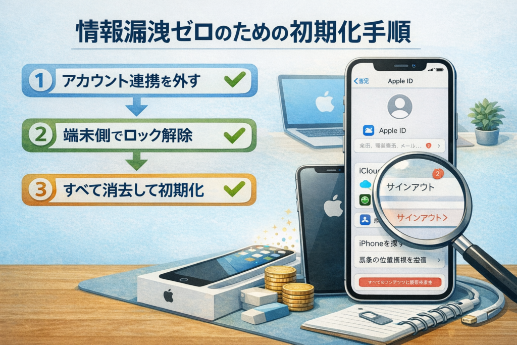 「初期化したから安全」と思いがちですが、実務では“初期化の前後”に落とし穴があります。ポイントは、端末がオンラインで認証できる状態のうちに、アカウント連携と管理ロックを外し切ることです。特に法人のiPadは、MDMやApple Business Managerに紐づいたまま消去すると、次の利用者がセットアップできない状態になりやすく、結果的に買取不可や大幅減額につながります。個人のiPhoneでも、iCloudサインアウトが未完了のまま「消去」を実行すると、後からApple IDのパスワードや2段階認証が必要になり、手戻りが発生します。